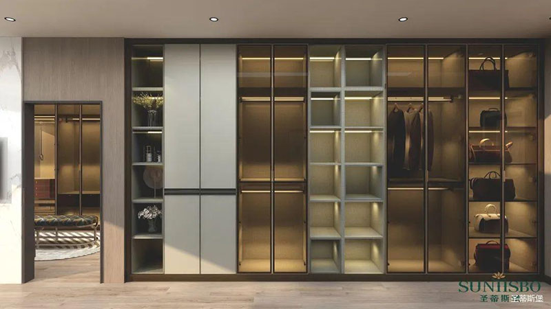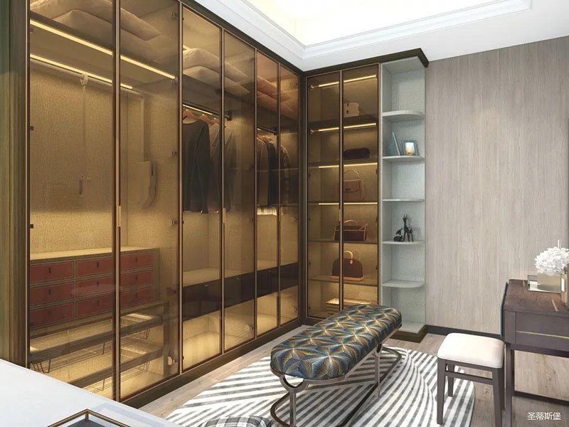 衣帽间开放式置顶设计,在追求简单到极致的基础上,给人感官一种简约整洁的整体感受。打破常规的空间储藏方式,脱离一切浮华与不实用,仅用最简单的线条反映出主人优雅的高品味。