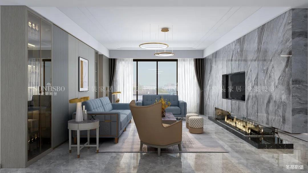 精细结构下沙发角几的微金属结构,干净利落,彰显质感。整面大理石背景墙将电视设计为壁龛结构,底部的装饰壁炉让家的温馨感再度升级。