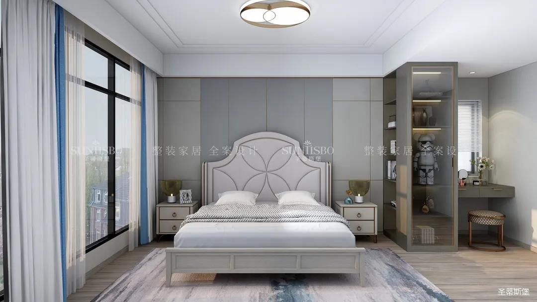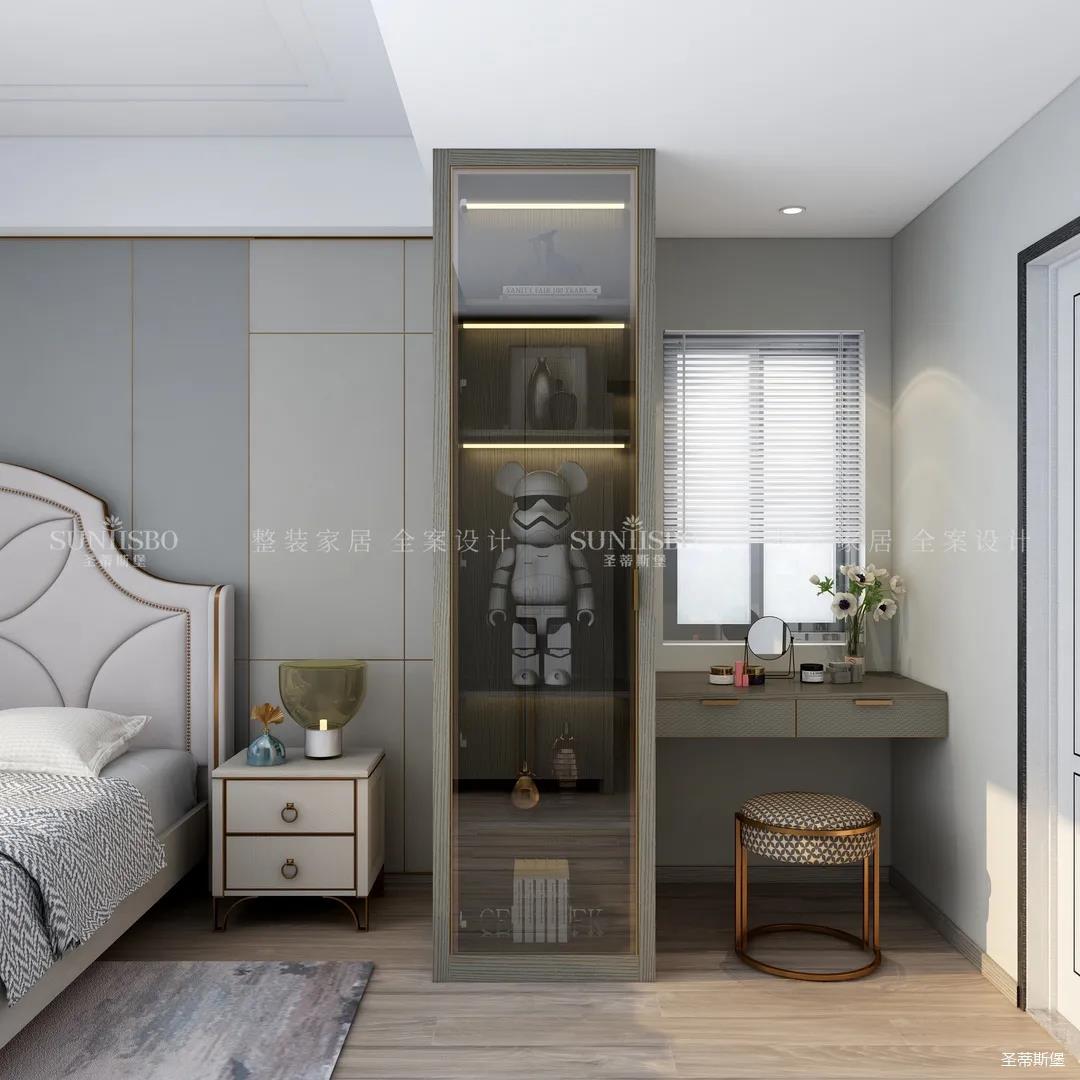 主卧的设计,整体风格与色调的一致,通过空间设计与软装细节的调控,显得主卧多了一份宁静与放松。四照花床屏的细节、材质色彩的把握、隔断小书桌的设计,无不体现着设计师独特的品位和全案设计的能力。