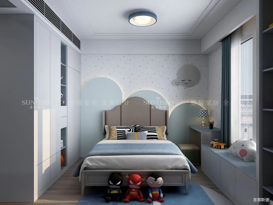 儿童房追求的是童真与自然,柜体的色彩与软装搭配完美呼应,云朵山峰的背景墙,以特立独行的设计在视觉上让心灵得到放空的意境。沿窗打造的飘窗格局,增加空间的功能性,造型简约的柜体根据家装理念摒弃了繁复的设计,更多展现的是空间自然之美。